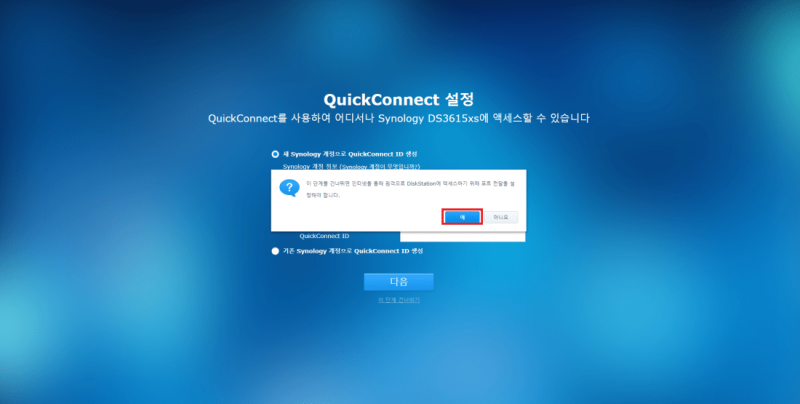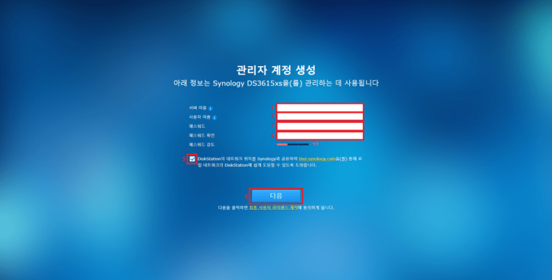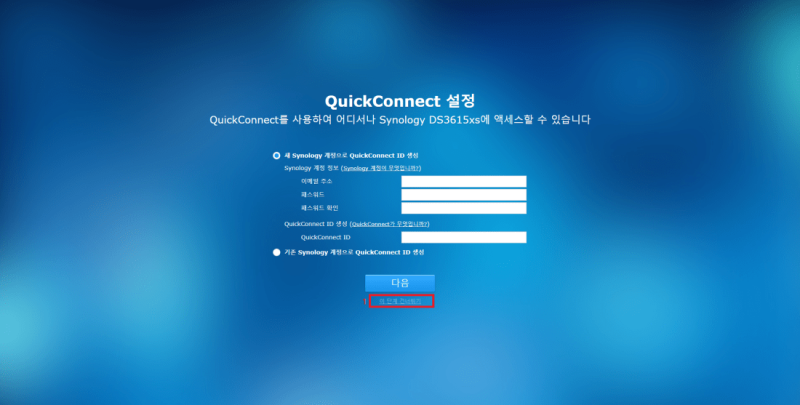 Xpenology의 경우 시놀로지사에서 제공하는 기능에 제한을 주는 경우가 있으므로(블럭 처리) 가능하면 시놀로지와 연동하지 않는 것이 좋습니다. 하단 체크박스는 체크해제 후 다음 버튼을 클릭합니다.