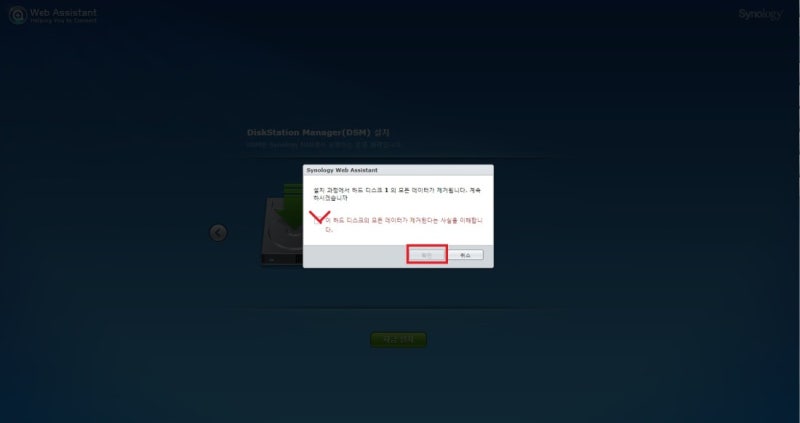자작 NAS에서 인식된 하드디스크 개수가 표시됩니다. 정상적으로 인식된 것이 맞으면 체크박스에 체크한 뒤 설치를 진행합니다. 설치 진행시 기존에 디스크에 저장되어 있는 자료는 삭제됩니다.