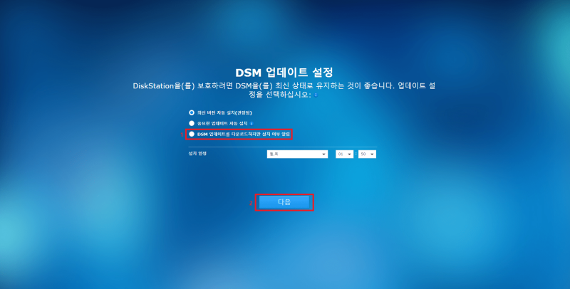 마찬가지로 DSM 자동 업데이트 하지 않음으로, QuickConnect 사용하지 않음으로 선택합니다. Xpenology의 경우 버전업에 따라 부트로더가 변경되는 경우가 있기 때문에, 최신 버전으로 업데이트를 진행하시기 전에 구글링을 통해 업데이트 후에도 사용 가능한지 확인 후 진행하셔야 합니다.