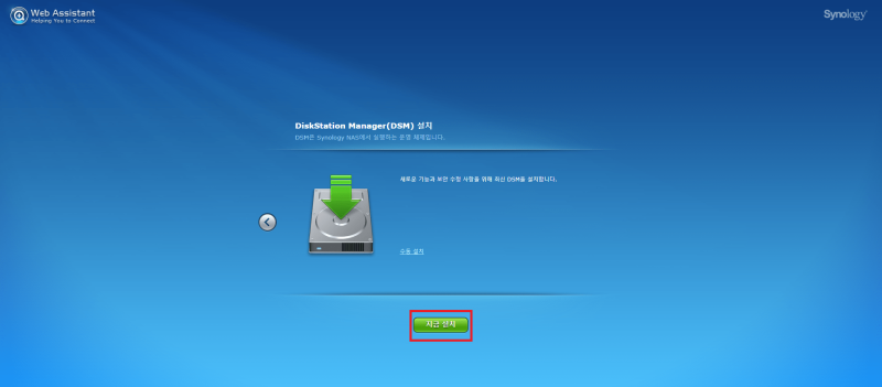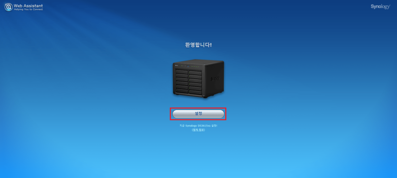 설치된 컴퓨터가 아닌 다른 컴퓨터의 웹브라우저를 실행한 뒤, find.sysnology.com 으로 접속합니다. 동일한 네트워크에 있을 경우 자동으로 자작 NAS를 검색하며 위와 같은 화면이 나타나면 설정 버튼을 클릭합니다.