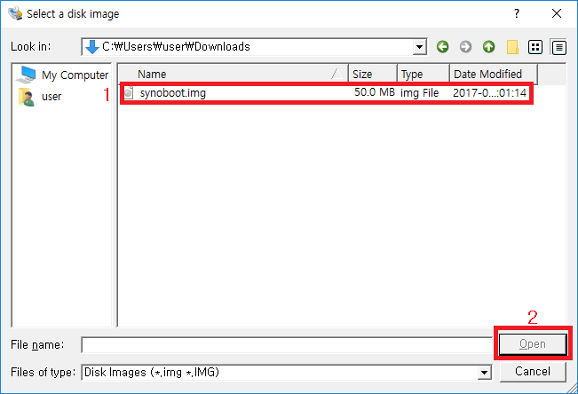 우측 폴더 모양 버튼을 클릭하여 위에서 받은 img 이미지 파일을 선택합니다.