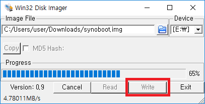 우측 Device가 설치하고자 하는 USB 경로가 맞는지 확인하신 후, Write 버튼을 눌러 설치를 진행합니다.