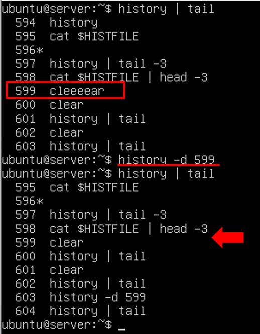 | -d offset | history 명령어 치면 첫 번째 열에 offset이 있는데 offset 위치에 있는 history 명령어를 삭제합니다. |