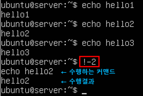 '내가 2번째 전에 쳤던 명령어, 3번째 전에 쳤던 명령어' 이런 방식으로 역순으로 명령어를 실행시키고 싶을 수 있겠죠. 그럴 때는 '-'를 붙여서 '!-n'을 치면 됩니다.