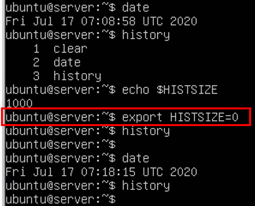 HISTSIZE는 히스토리에 저장 가능한 커맨드 개수로, 이 값을 0으로 지정하면 한 개도 저장할 수 없기 때문에 history 결과가 뜨지 않습니다.